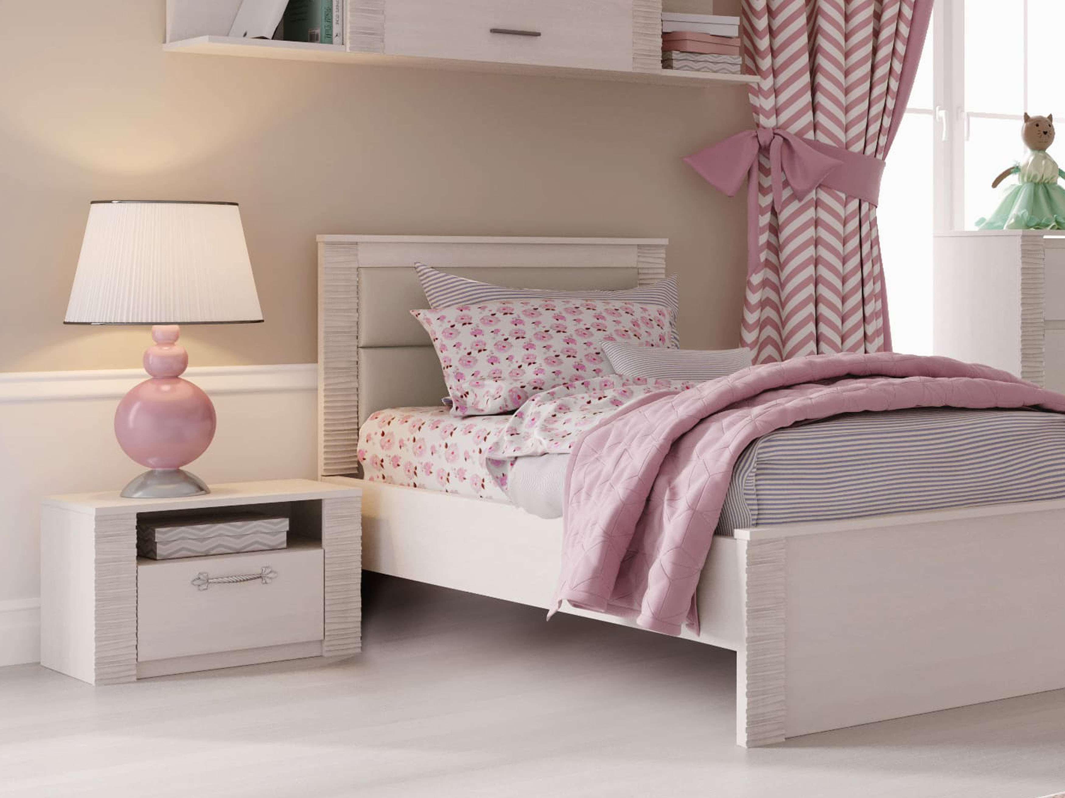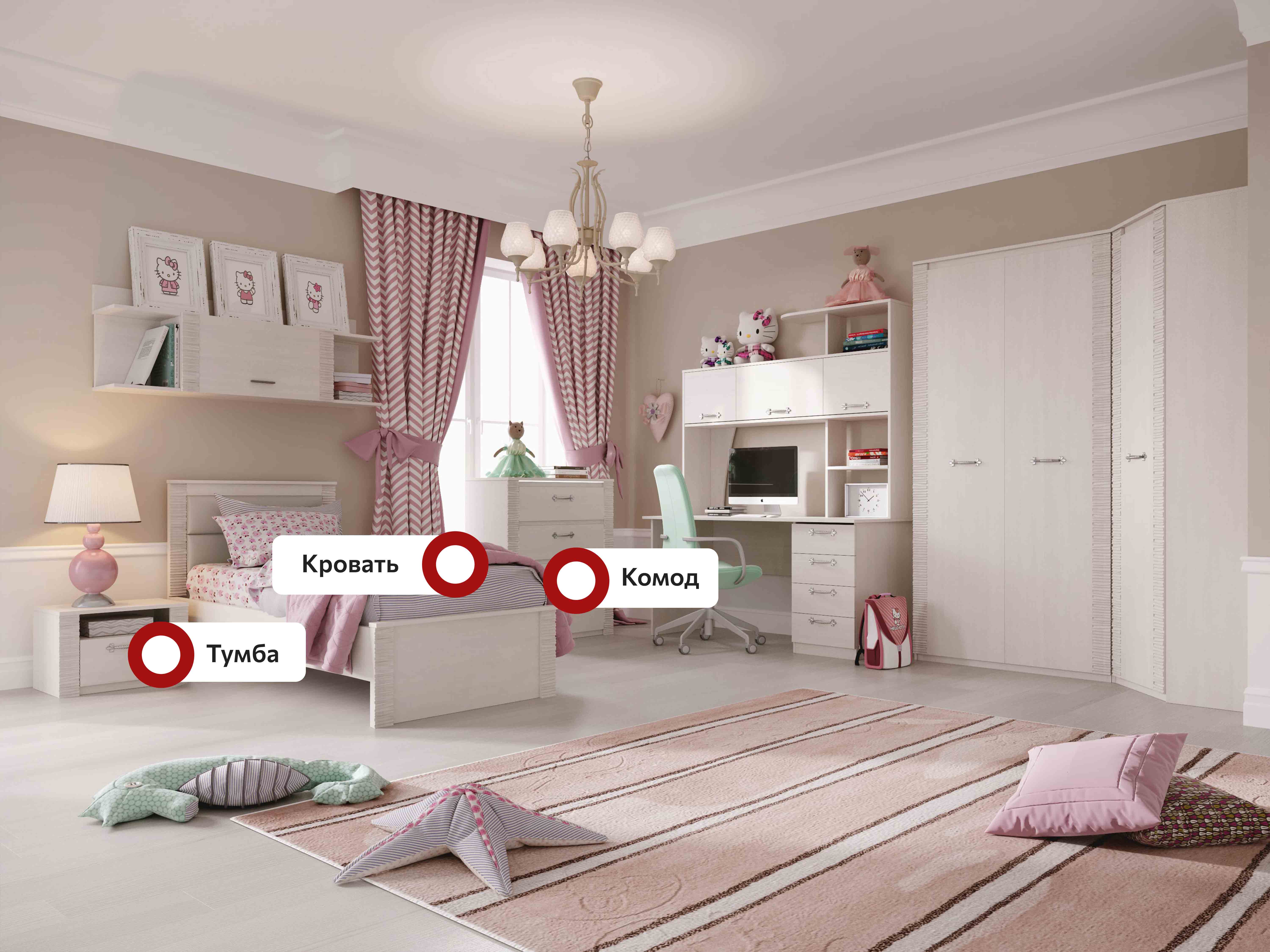 В состав коллекции входят: шкаф однодверный, шкаф угловой, шкаф двухдверный, комод, стол компьютерный, тумба прикроватная, кровать.