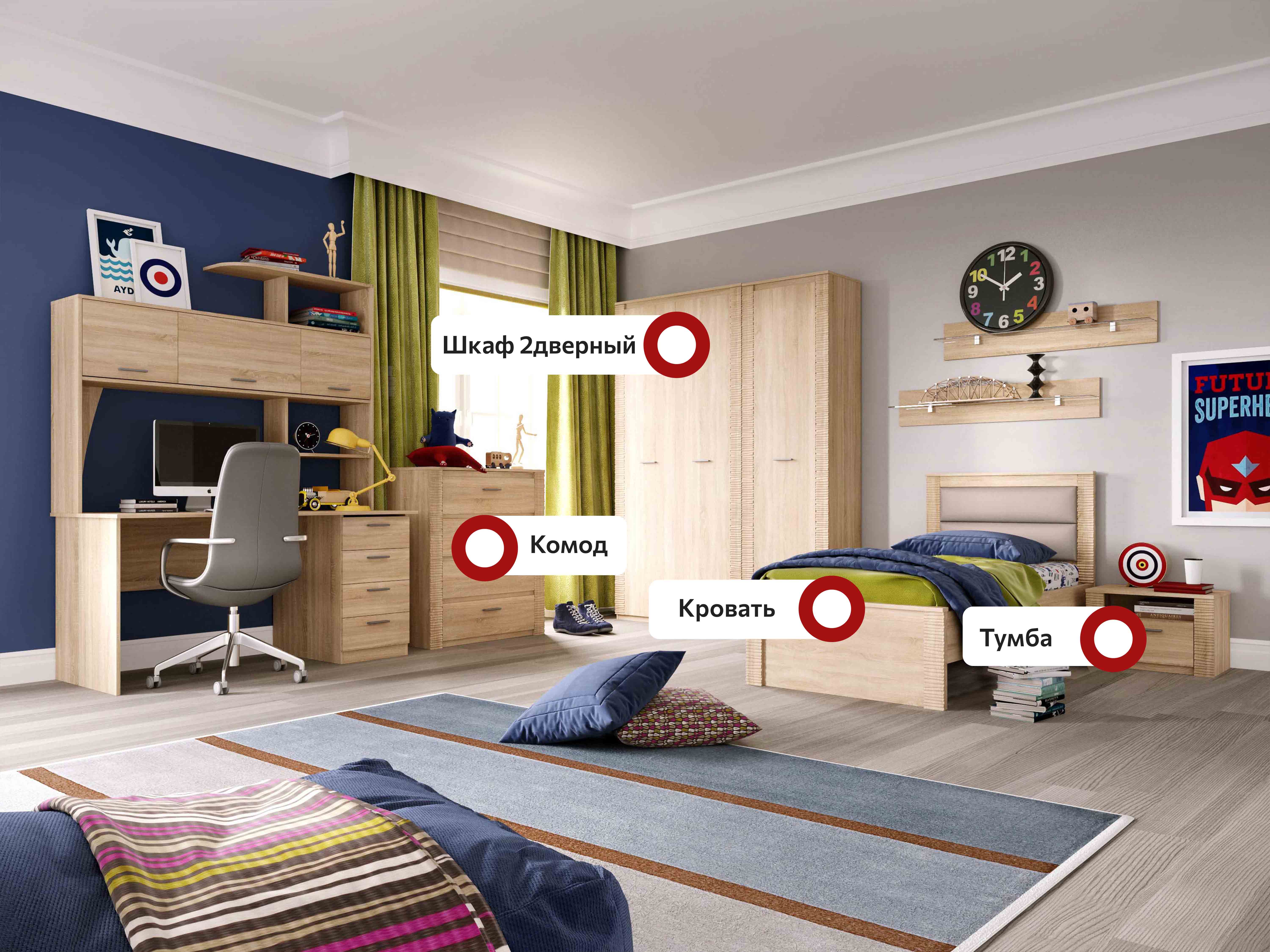 В состав коллекции входят: шкаф однодверный, шкаф угловой, шкаф двухдверный, комод, стол компьютерный, тумба прикроватная, кровать.