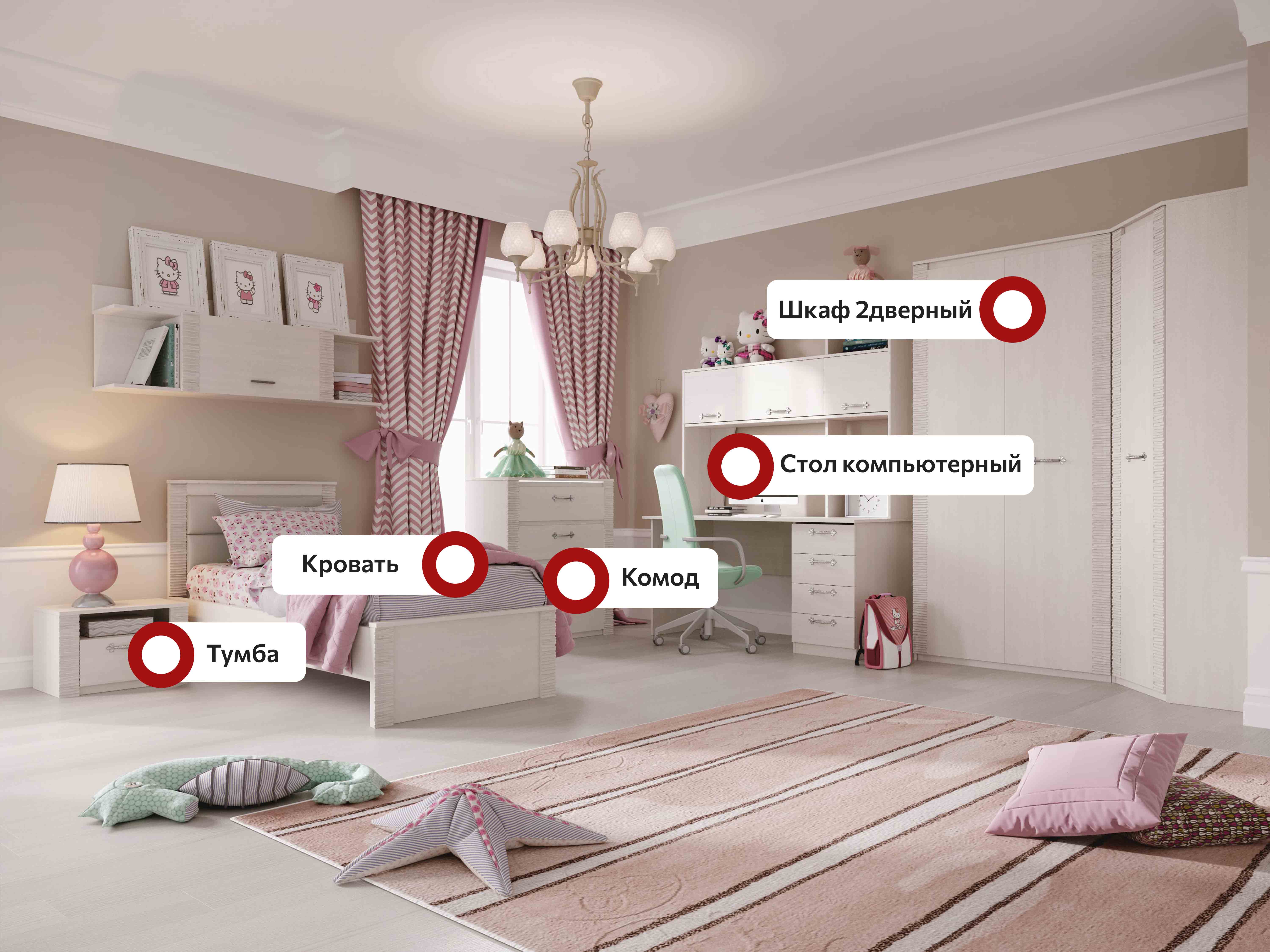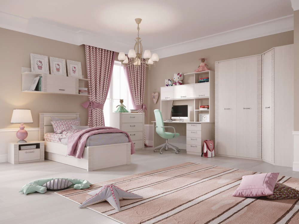 В состав коллекции входят: шкаф однодверный, шкаф угловой, шкаф двухдверный, комод, стол компьютерный, тумба прикроватная, кровать.