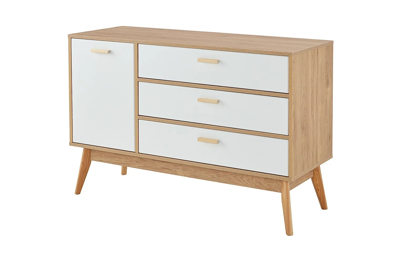 Каркас комода изготовлен из ЛДСП в цвет натурального дуба, фасады ящиков – из МДФ белого матового цвета, стильные, крепкие и устойчивые ножки - из массива березы. Материалы отличаются экологичностью, прочностью, долго сохраняют внешнюю привлекательность, просты в уходе.