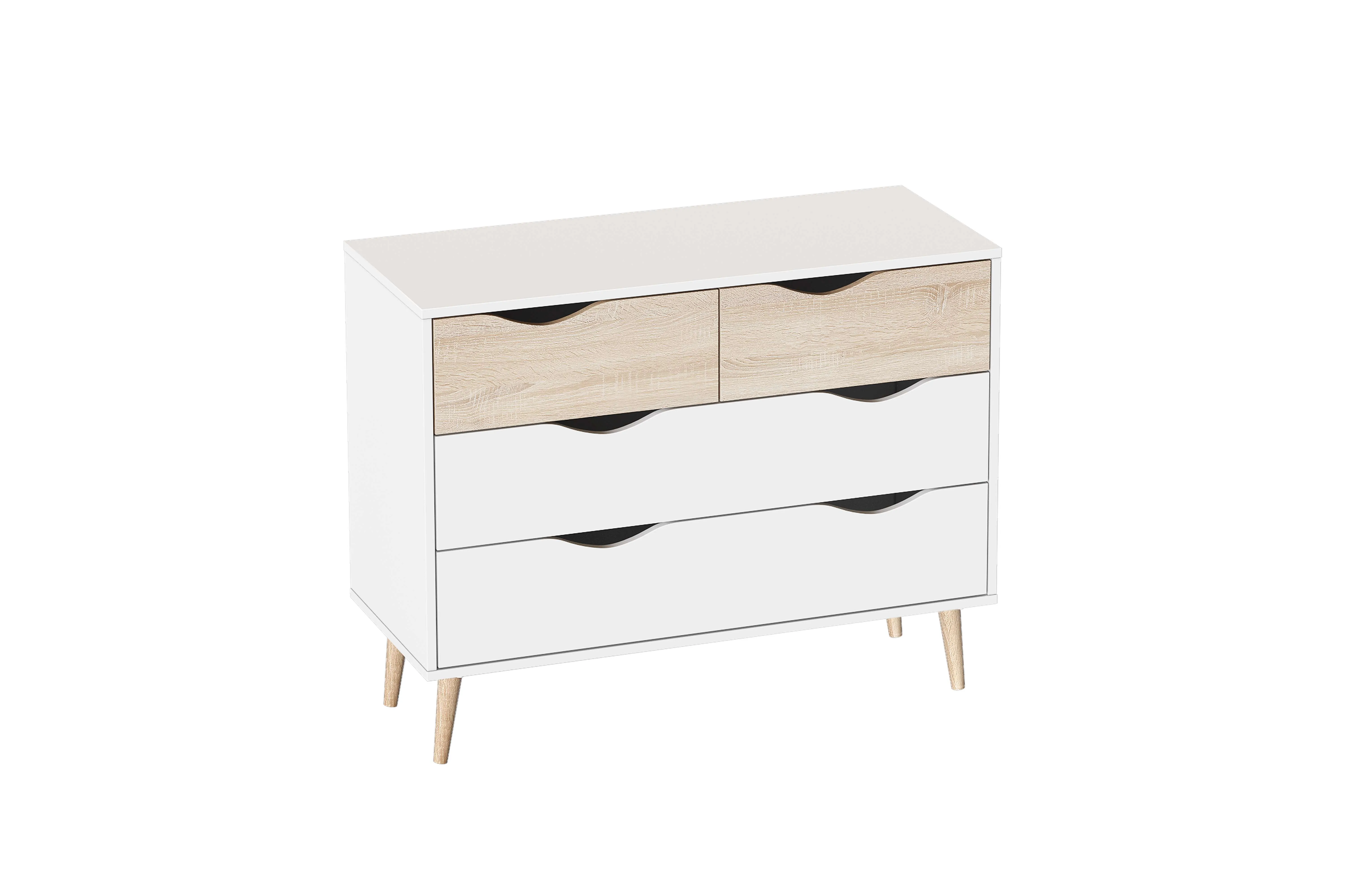 Серия «Соната» отличается простотой и натуральностью, выполнена в естественных тонах. В дизайне отчетливо улавливаются отсылки к скандинавской эстетике: чистые линии корпуса, использование белого цвета в отделке фасадов, расставленные в стороны высокие стильные опоры, выполненные из массива березы.