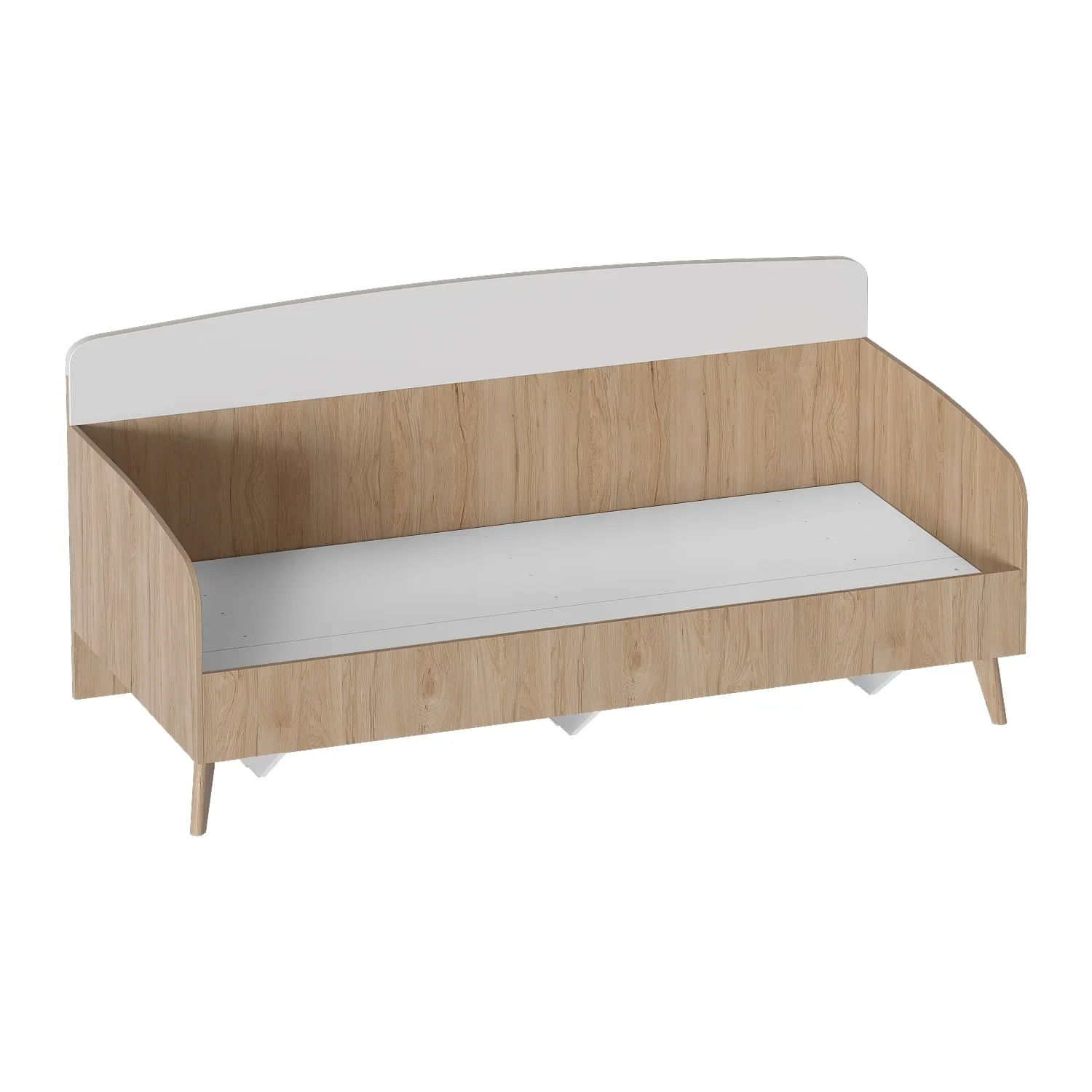 Кровать стоит на опорах из массива березы. Основанием матраса является настил из ЛДСП, закрепленный на стойках. Дополнительно может комплектоваться выкатным ящиком на роликовых опорах.