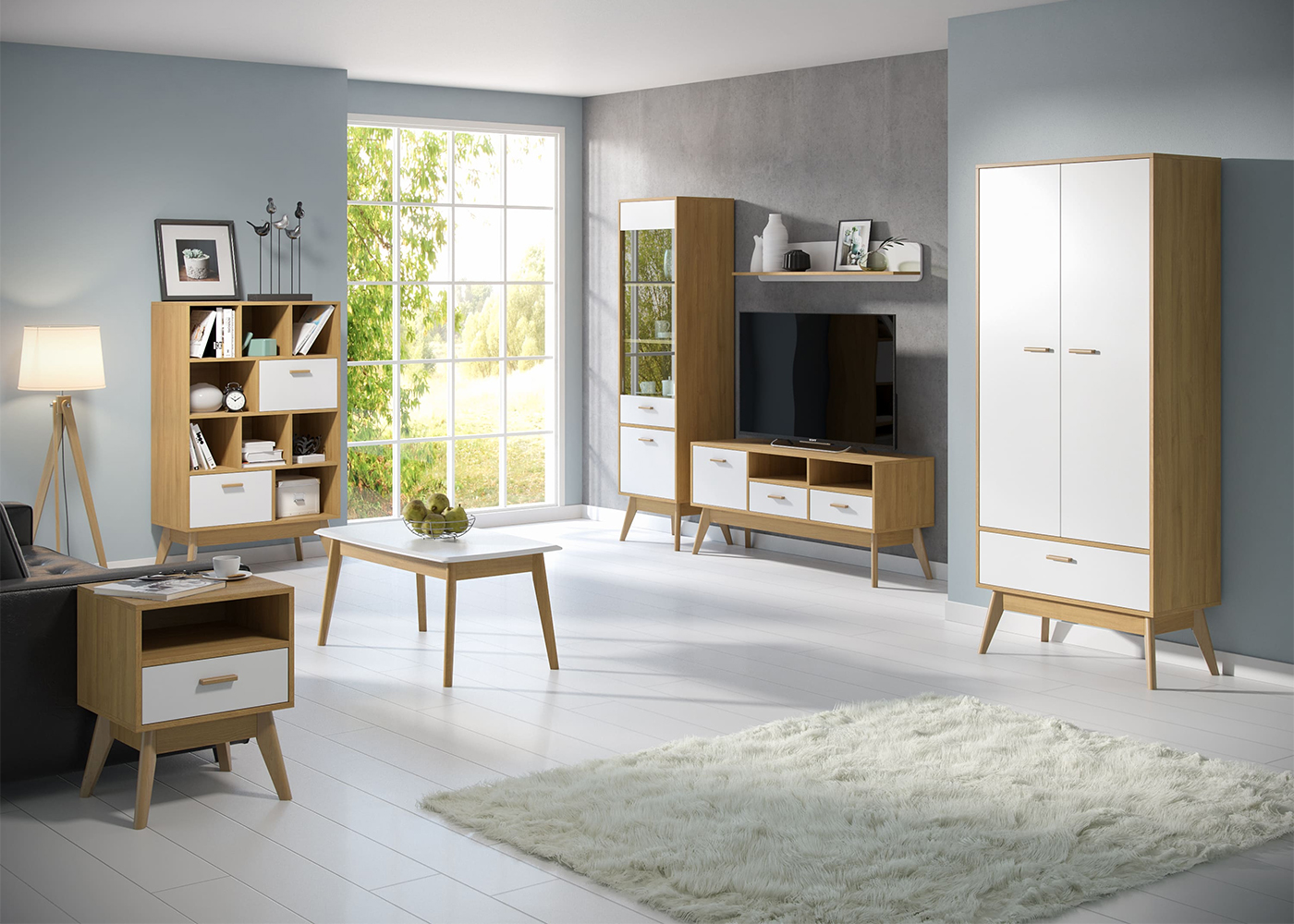 Внутри шкафа есть штанга для одежды и две глубоких полки, расположенных с правой стороны. В нижней части шкафа есть широкий вместительный выдвижной ящик на шариковых направляющих, который выдвигается легко и бесшумно. Корпус изделия выполнен из ЛДСП цвета натурального дуба. Фасады - из белого матового МДФ. Ручки сделаны из массива березы.