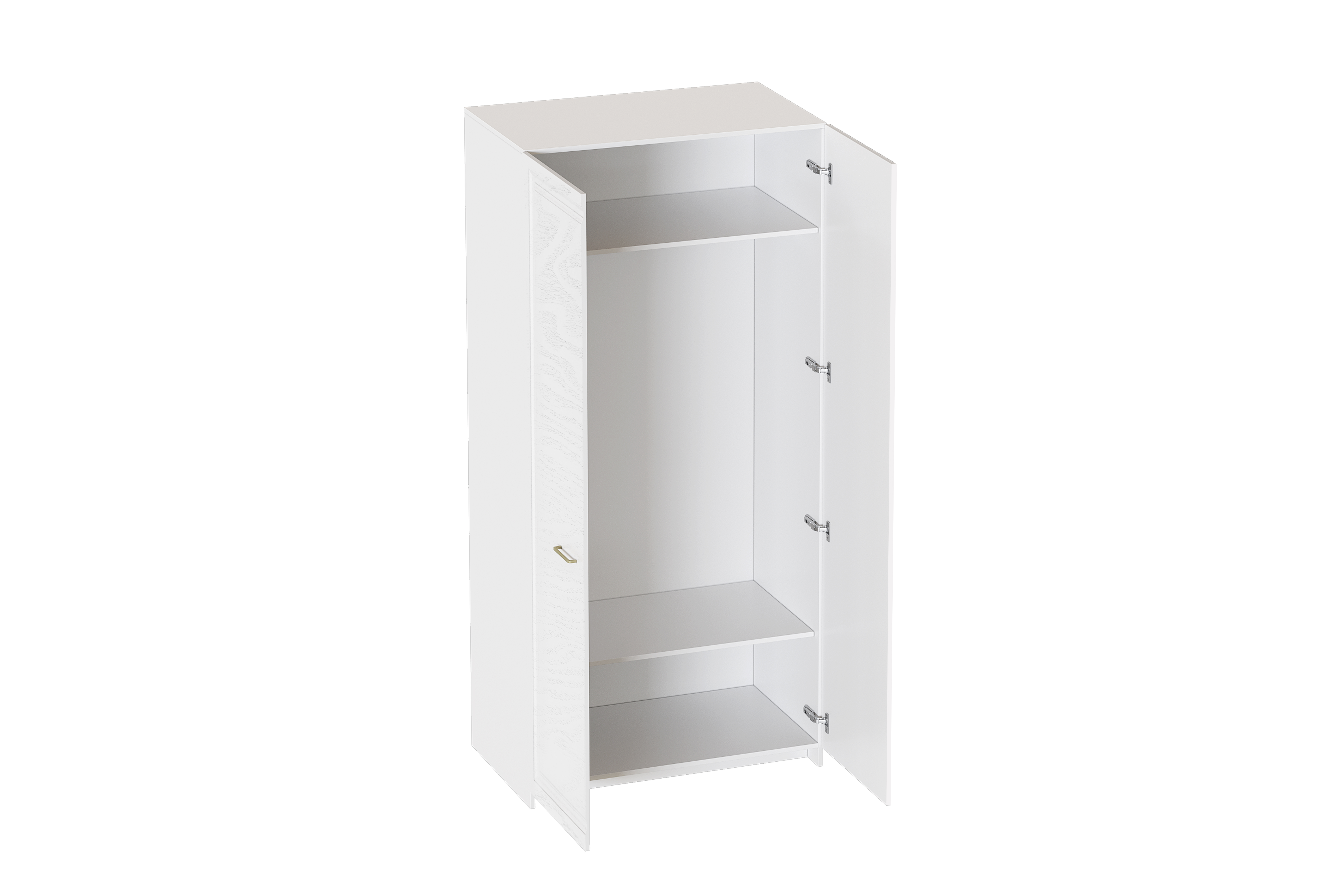 Шкаф выполнен в цвете Айс 06 / Белый Аляска. Классическая фрезеровка фасадов и ручки-скобы из брашированного золота придают изделию особый шарм и элегантность. Внутреннее пространство шкафа разделено натри секции. Верхняя секция шкафа отделена жёсткой полкой. В средней секции под жёсткой полкой расположена овальная штанга. Нижняя секция отделена от средней съемной полкой. Двери оснащены петлями с амортизаторами.