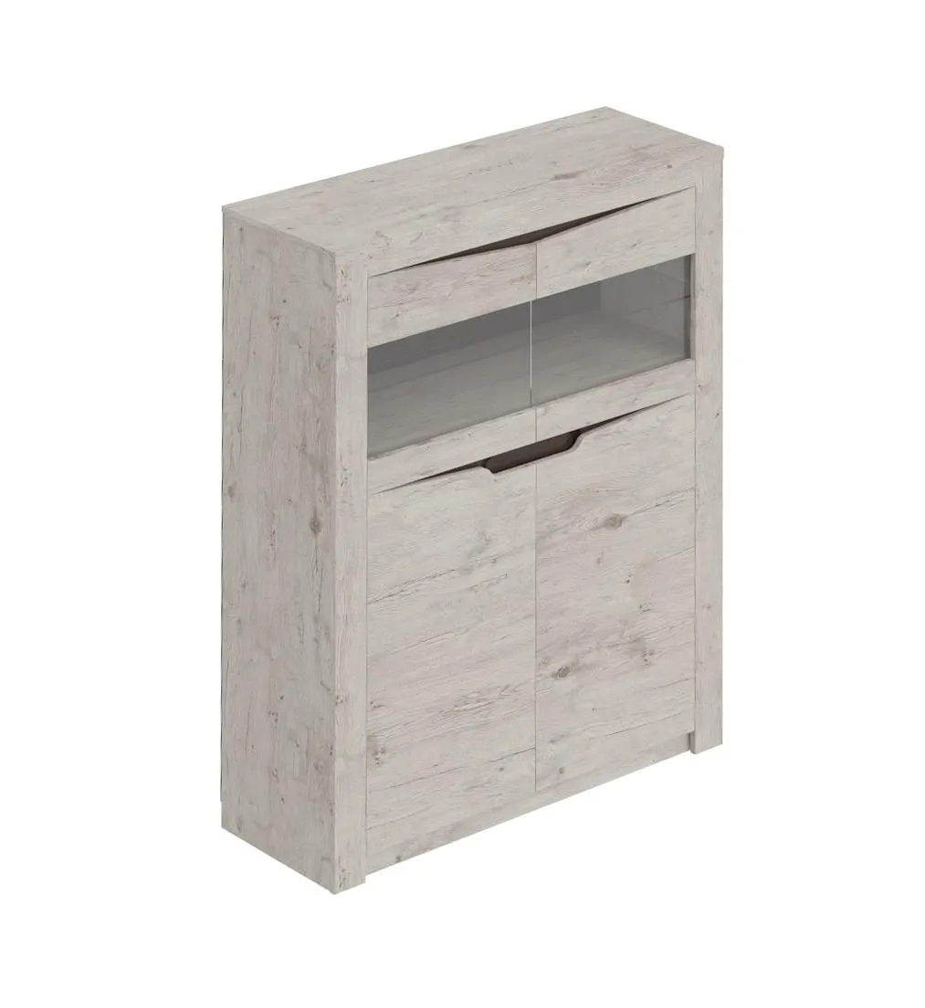 Внутри несъемная полка усиливает жесткость шкафа. Над стационарной полкой устанавливаются одна съемная стеклянная полка, из прозрачного стекла толщиной 5 мм, а в двух нижних отделениях устанавливаются четыре щитовые полки. Внутреннее пространство шкафа закрыто двумя составными дверями, имеющими по одной стеклянной вставке в верхней части.