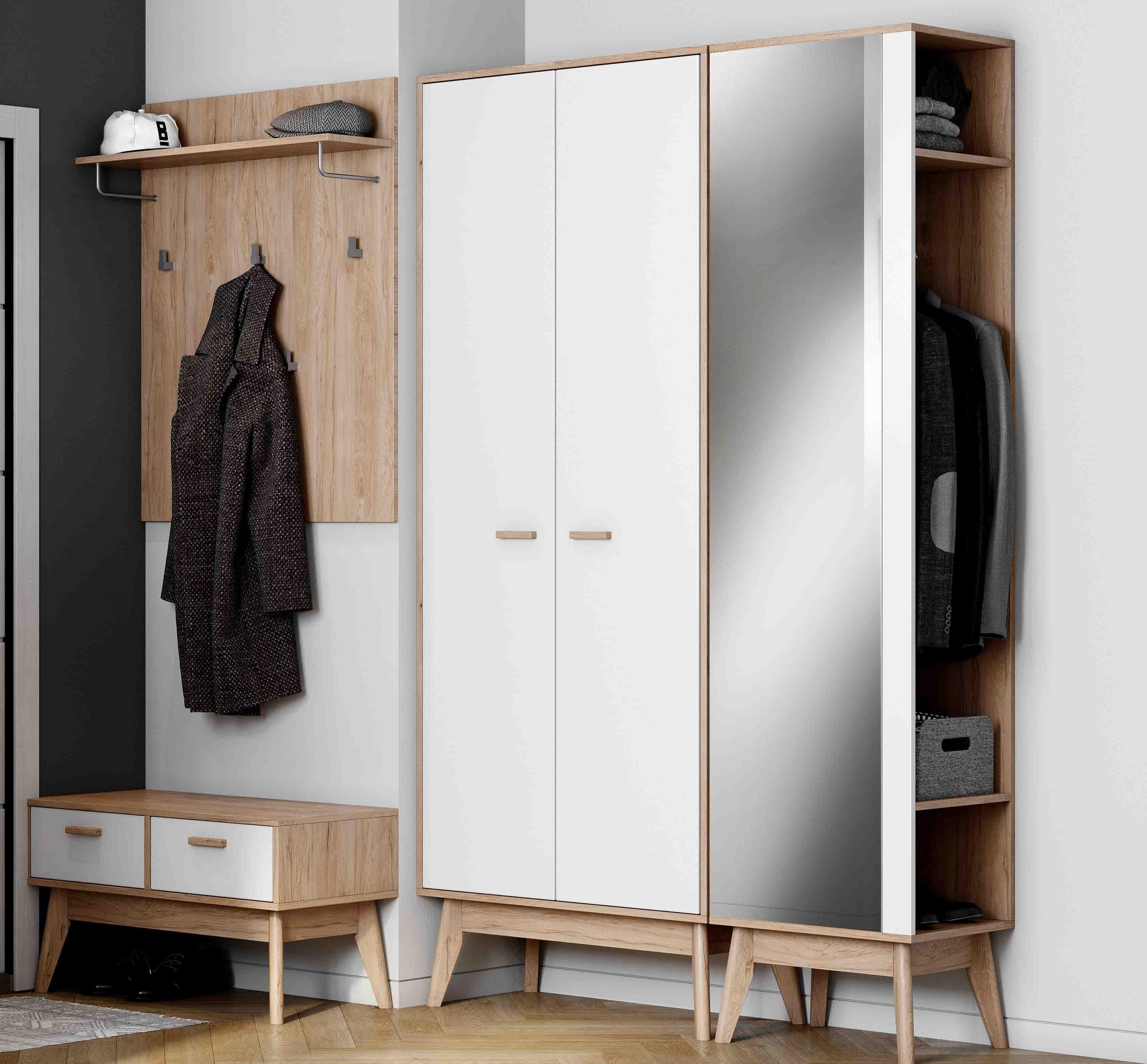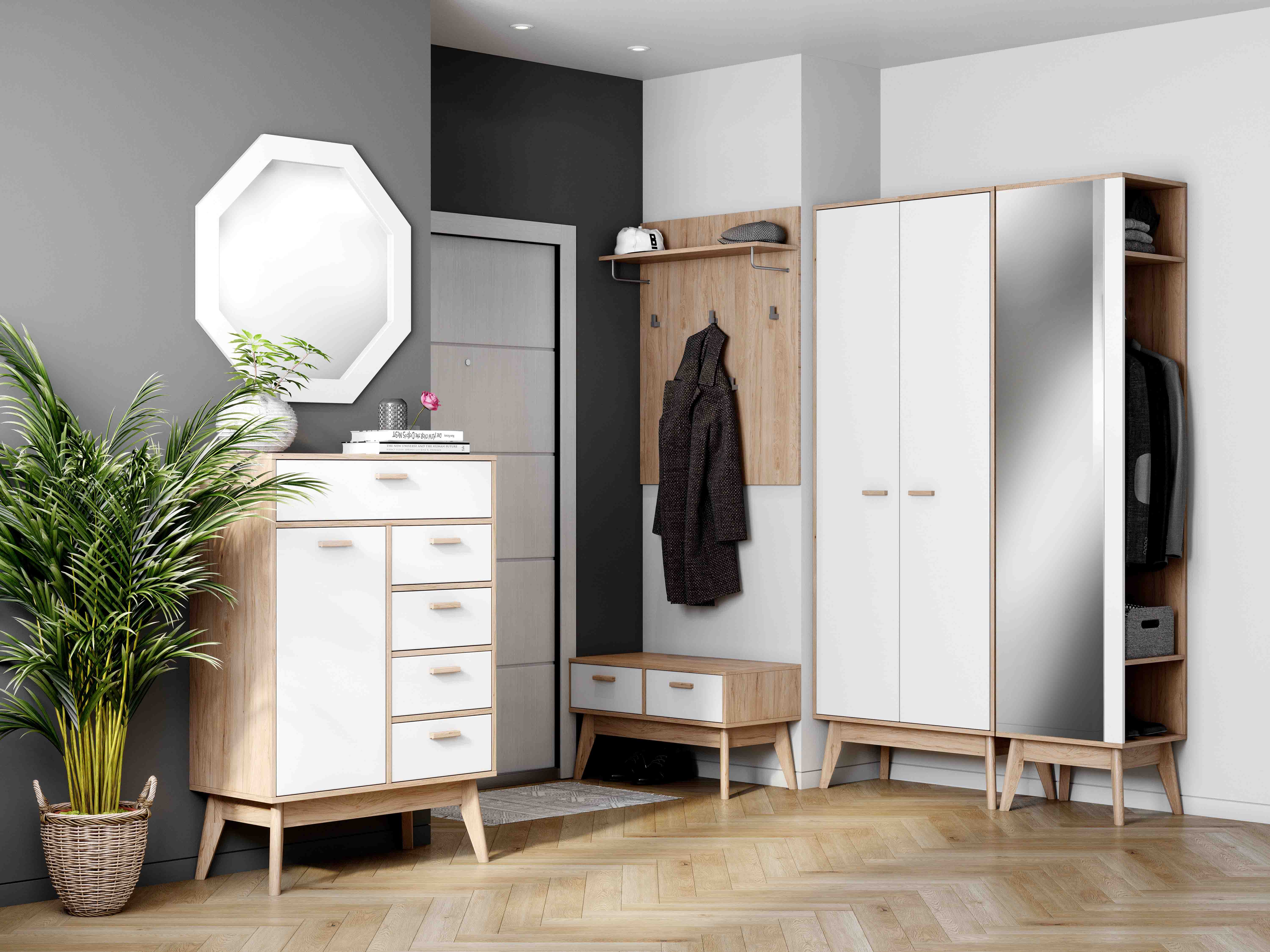 Шкаф "Калгари" для прихожей - это высокий, достаточно узкий и в то же время вместительный гардероб с выдвижной штангой для одежды на плечиках, белоснежными дверцами из МДФ и корпусом из ЛДСП цвета натурального дуба, который хорошо впишется в вашу прихожую, выполненный в модном скандинавском стиле.