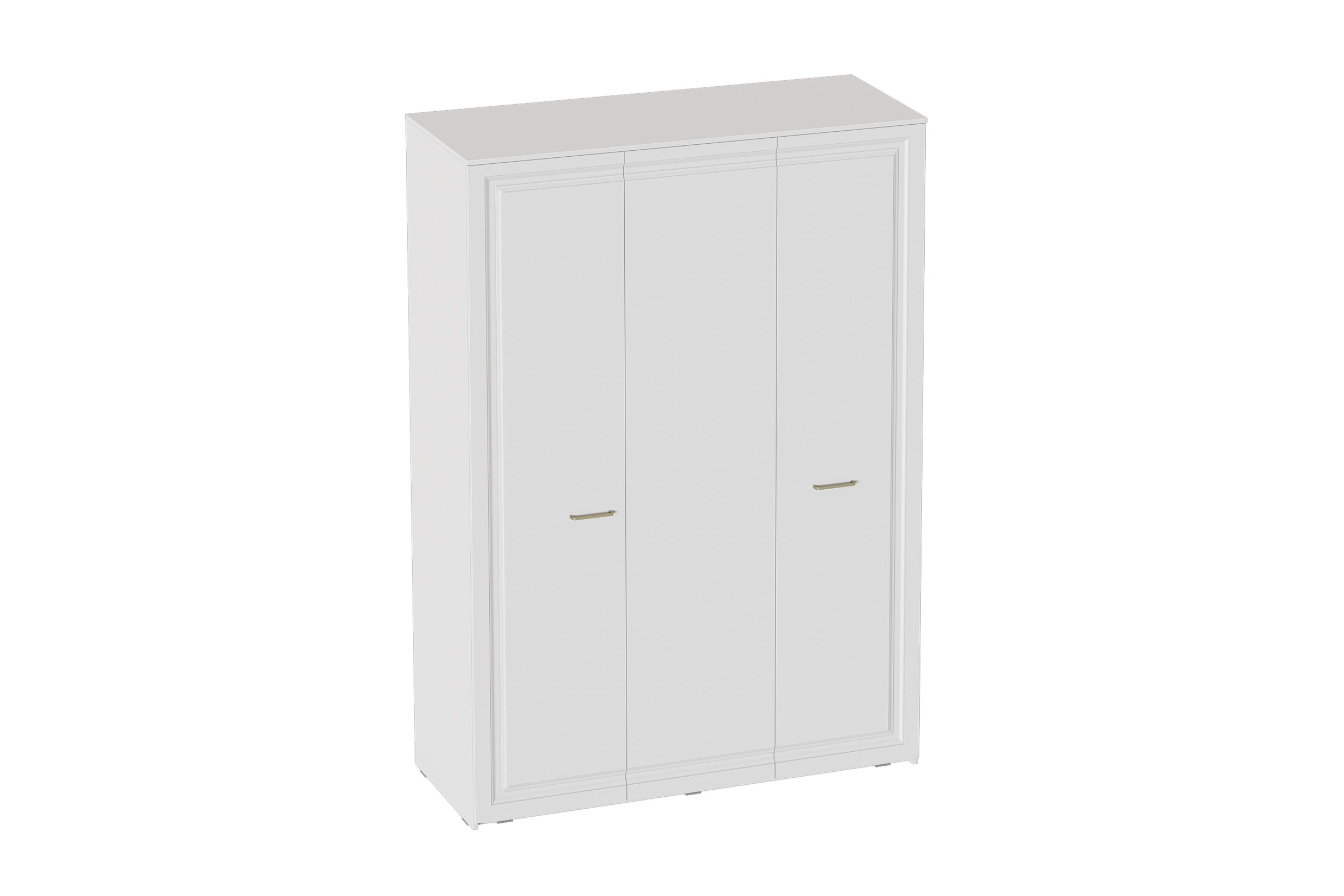 Шкаф выполнен в цвете Айс 06 / Белый Аляска. Классическая фрезеровка фасадов и ручки-скобы из брашированного золота придают изделию особый шарм и элегантность. Внутреннее пространство шкафа разделено на два отделения: слева находится отделение для одежды с одной большой стационарной полкой, одной большой съёмной полкой и продольной металлической штангой; справа находится отделение с одной небольшой стационарной полкой и четырьмя съёмными полками. Двери шкафа оснащены петлями с амортизаторами.
