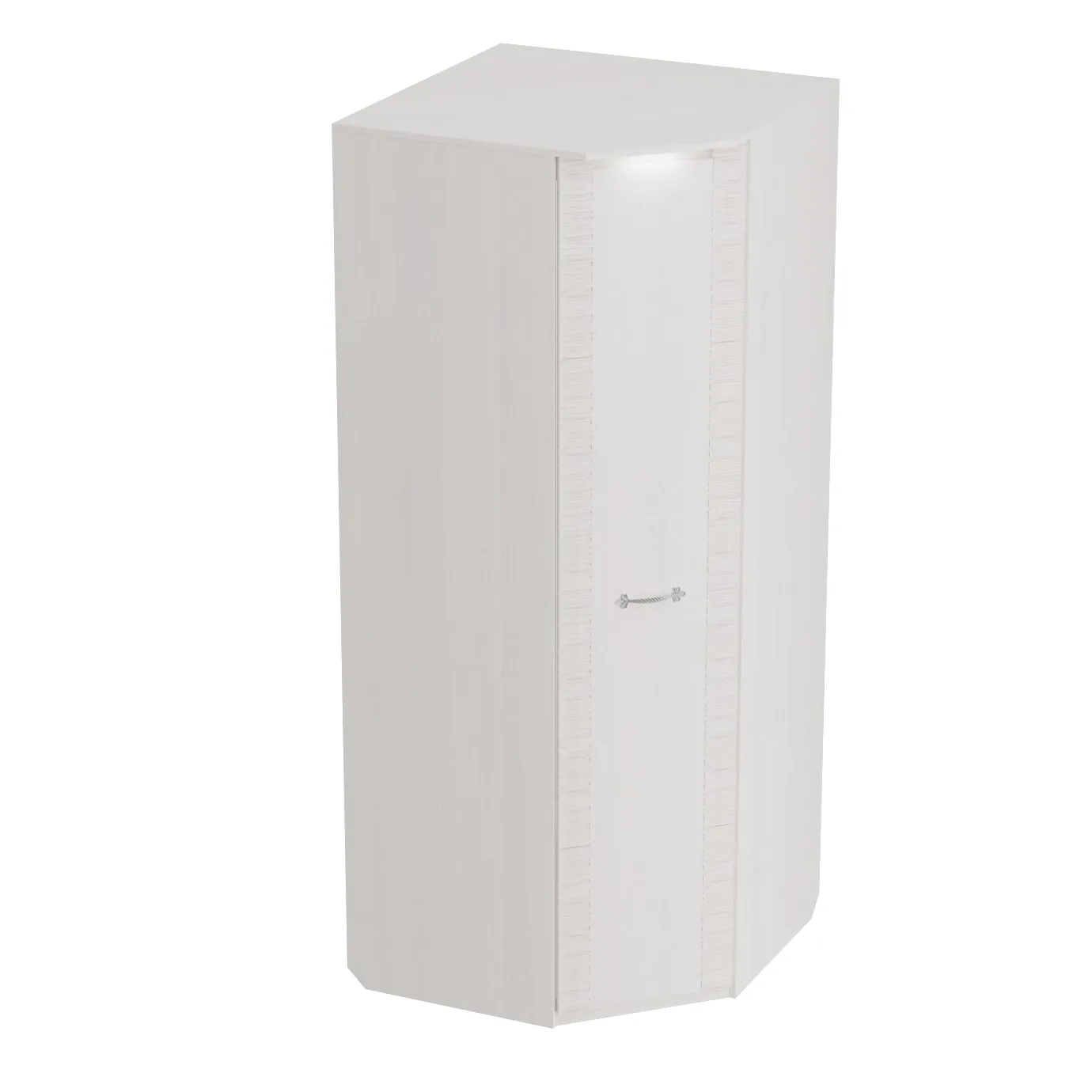 Угловой шкаф оснащен двумя отделениями: для белья с четырьмя жёсткими полками; платяное с жесткой полкой и продольной стальной штангой. В колпаке шкафа имеется паз для светильника, входящего в комплект. Блок питания приобретается отдельно, и рассчитан на подключение шести светильников.