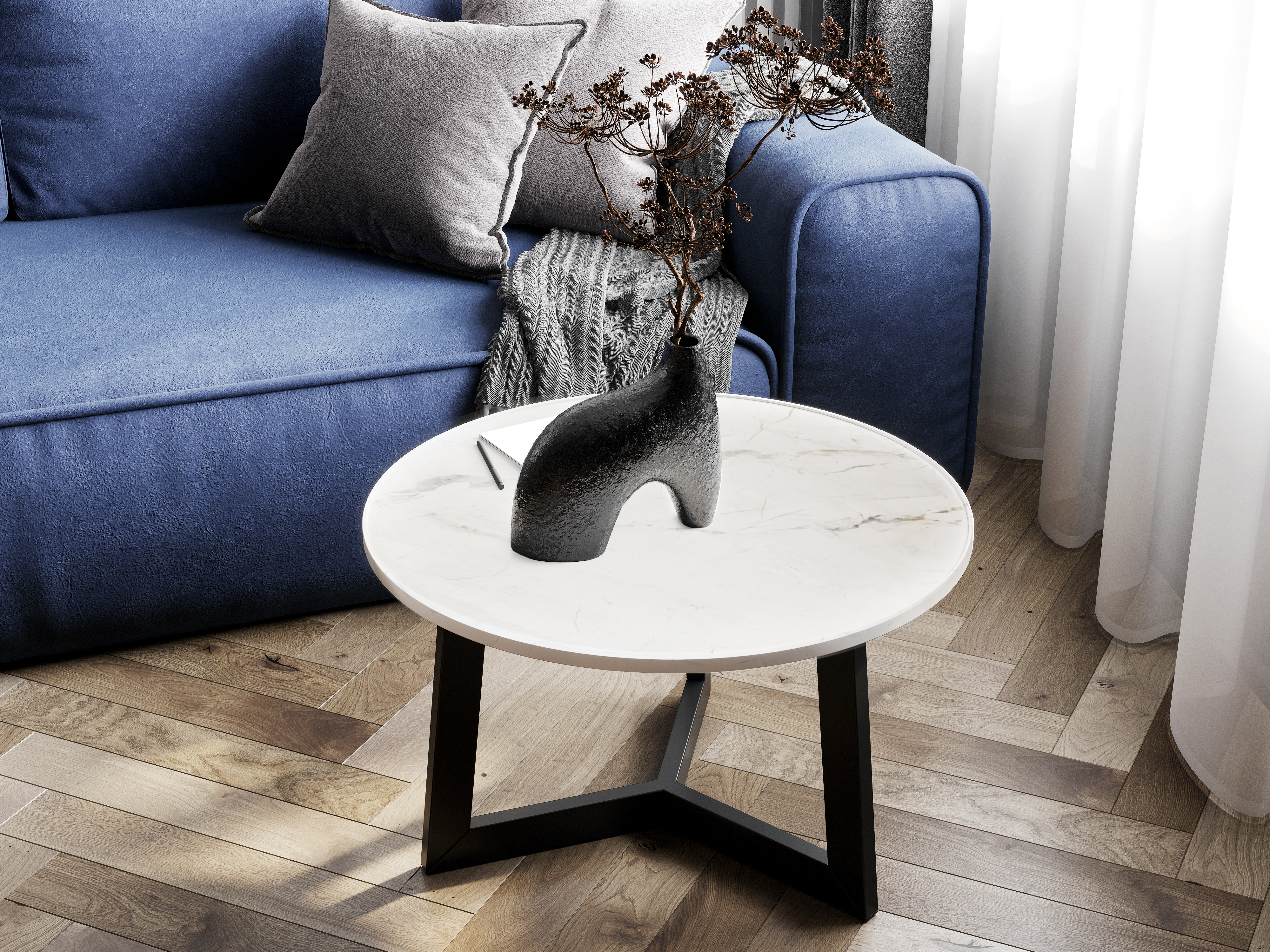 Стол с круглой столешницей из МДФ. Опорой для столешницы служит металлокаркас. Высота стола не регулируется. Изделие для удобства транспортировки выполнено полностью разборным.