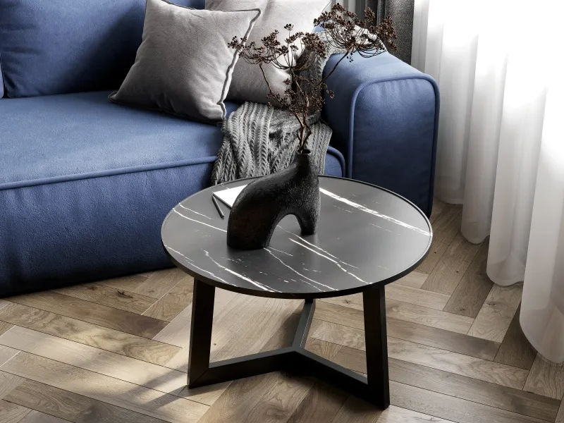 Стол с круглой столешницей из МДФ. Опорой для столешницы служит металлокаркас. Высота стола не регулируется. Изделие для удобства транспортировки выполнено полностью разборным.