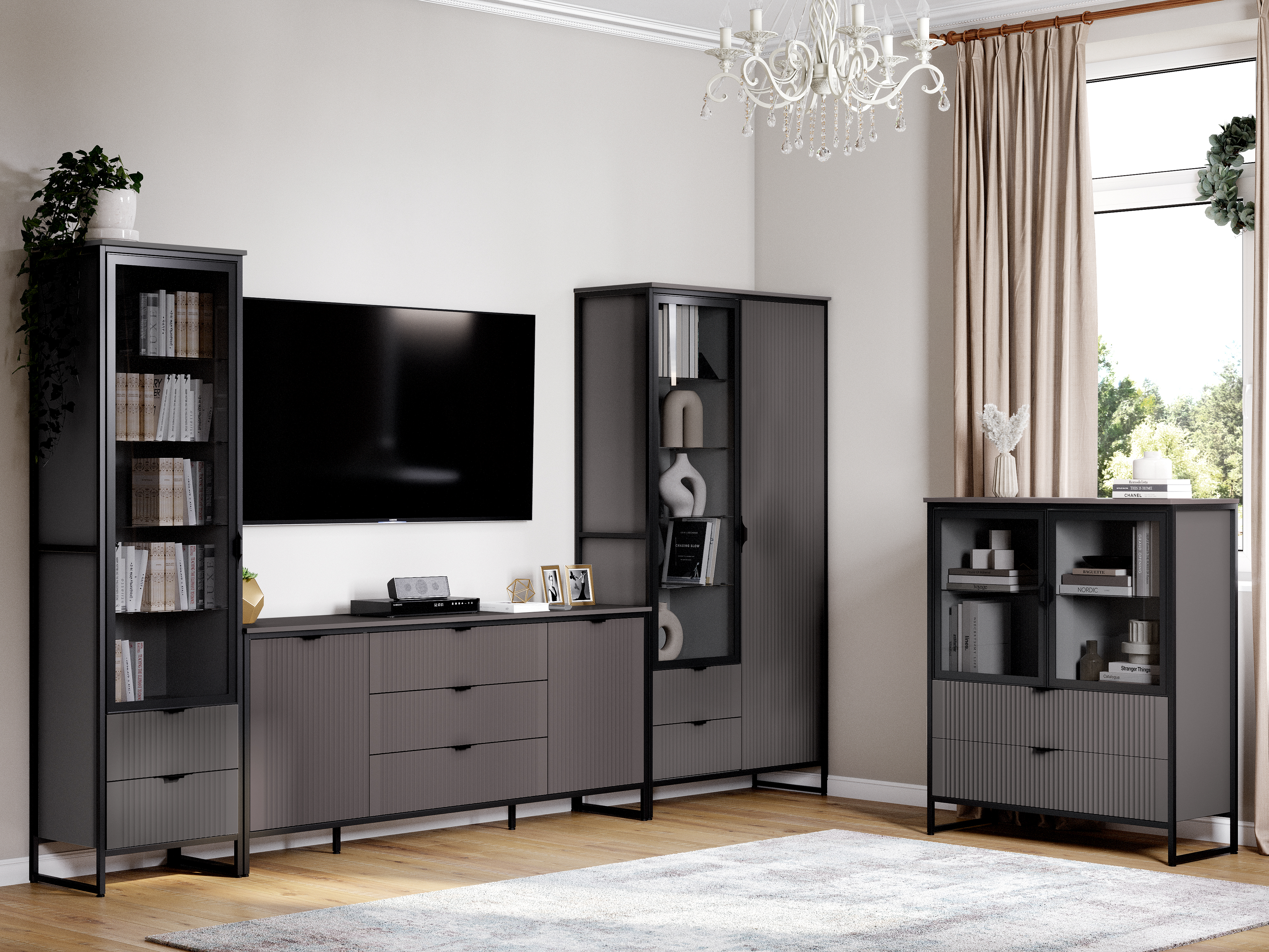 Коллекцию модульной гостиной "Нора" отличает современный оригинальный стиль. Декоративная продольная фрезеровка на фасадах из МДФ и опоры на металлокаркасе цвета соответствуют модным тенденциям этого года в ведущих зарубежных коллекциях.