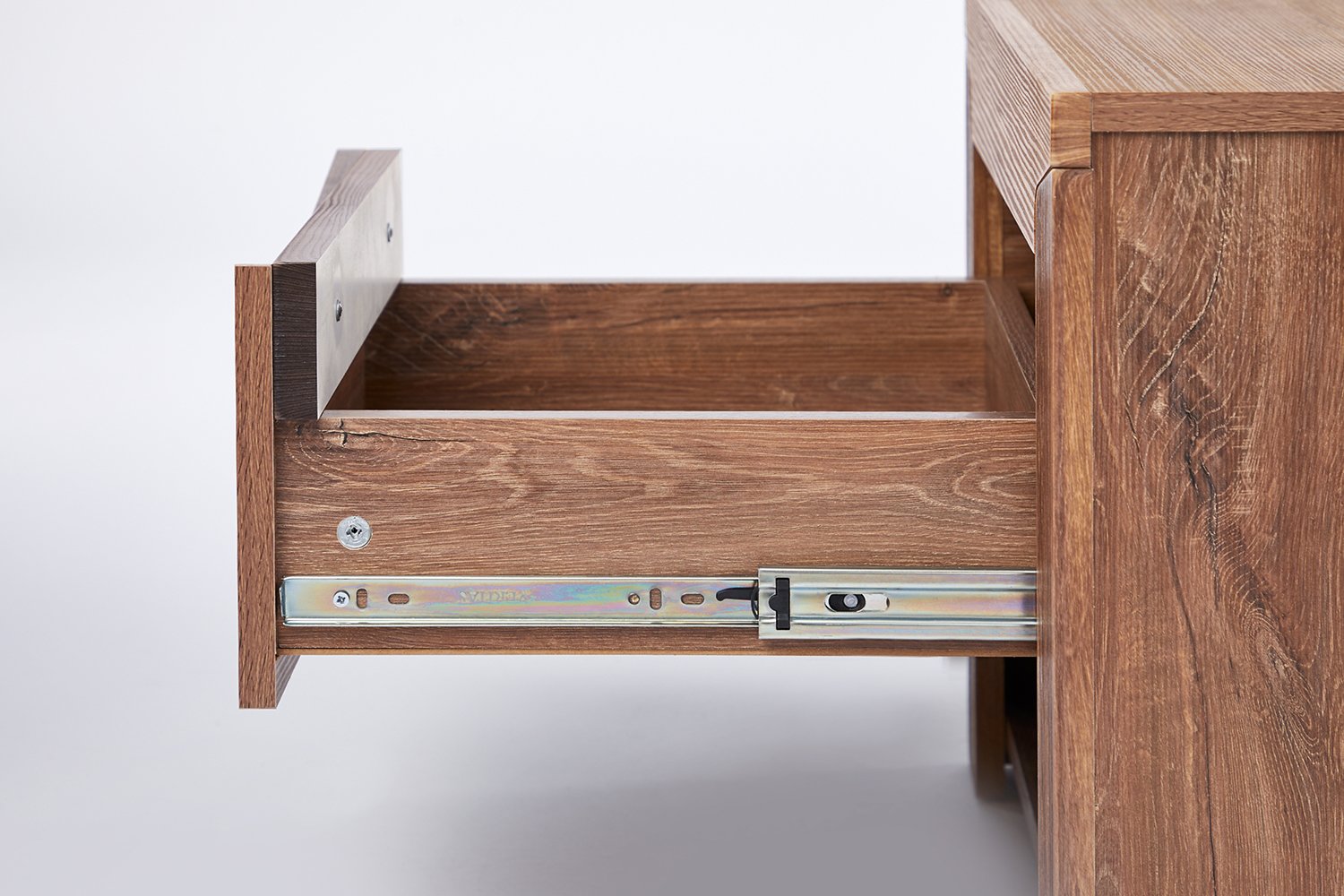 Прикроватная тумба "Соренто" имеет выдвижной ящик, для хранения мелких предметов, таких как пульт от телевизора, наушники, зарядные устройства. Открытое отделение тумбы позволяет хранить книги, журналы и другие предметы на видном месте. На фасаде имеется декоративный вырез, выполняющий функцию ручки.