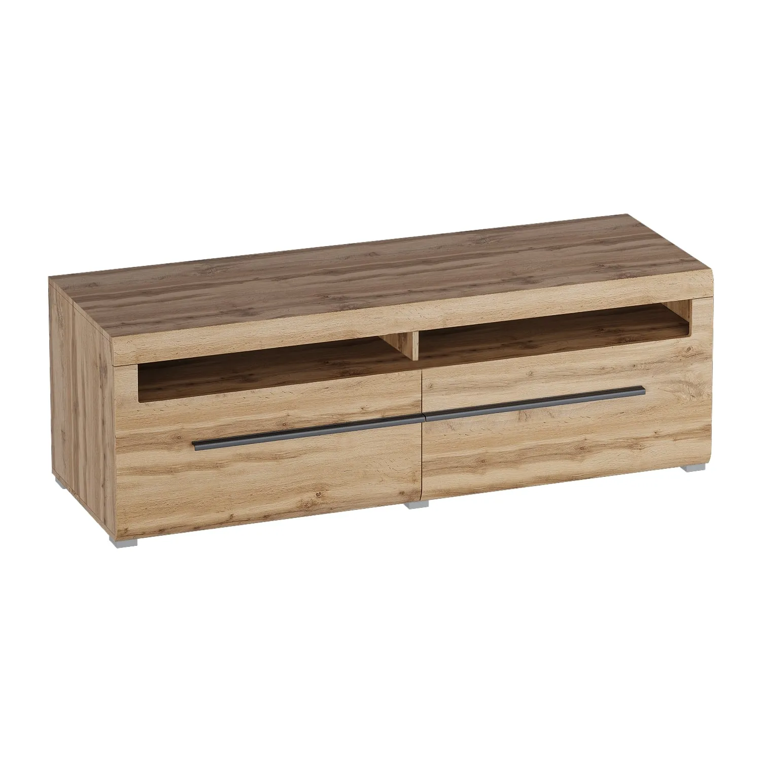 Корпус тумбы изготовлен из ЛДСП, фасады с закругленными линиями - из МДФ. Стиль изделия подчеркивают черные металлические ручки. Тумба имеет открытое отделение для хранения и два объемных выдвижных ящика на шариковых направляющих.