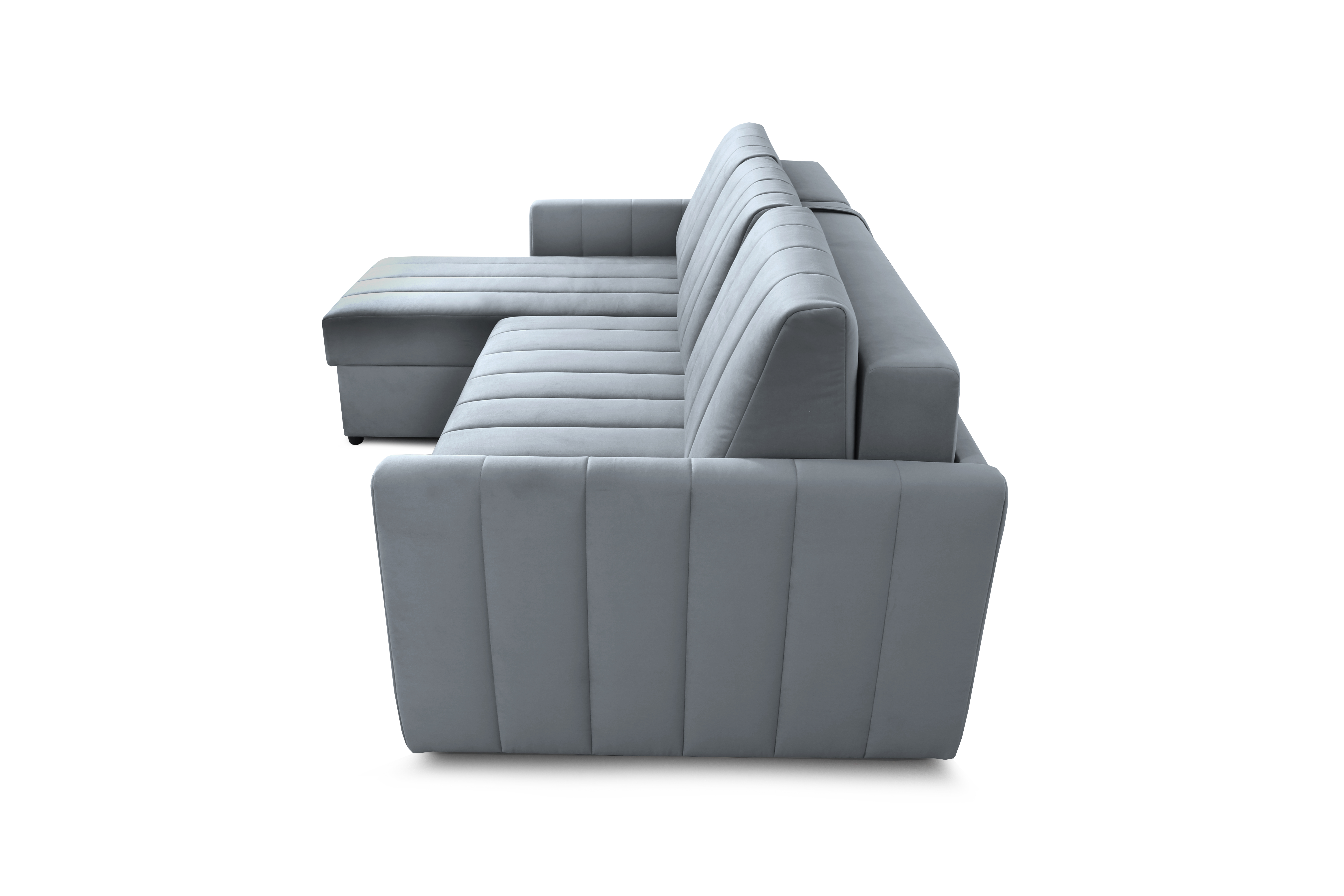 Приспинные подушки, сиденье и подлокотники дивана оформлены модной вертикальной стёжкой в современном стиле.